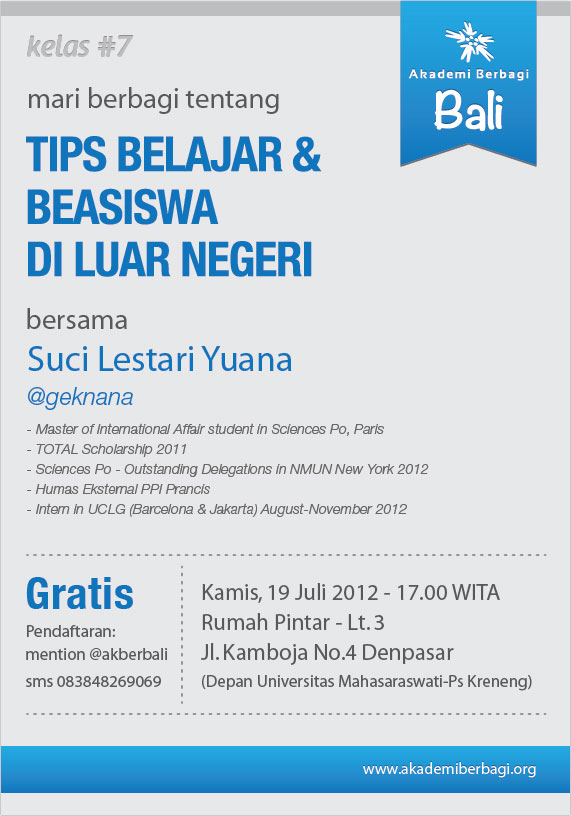 Pembicara nya memang mahasiswi yang sedang menempuh pendidikan di Perancis sana. Beliau sukses lolos berkat terapkan tips dapat beasiswa ke luar negeri. Siapa sih pembicaranya ini? Ternyata oh ternyata beliau berasal dari Bajera, Kabupaten Tabanan, bernama Suci Lestari Yuana. Nih akun twitter nya: @geknana. Nih blog nya.