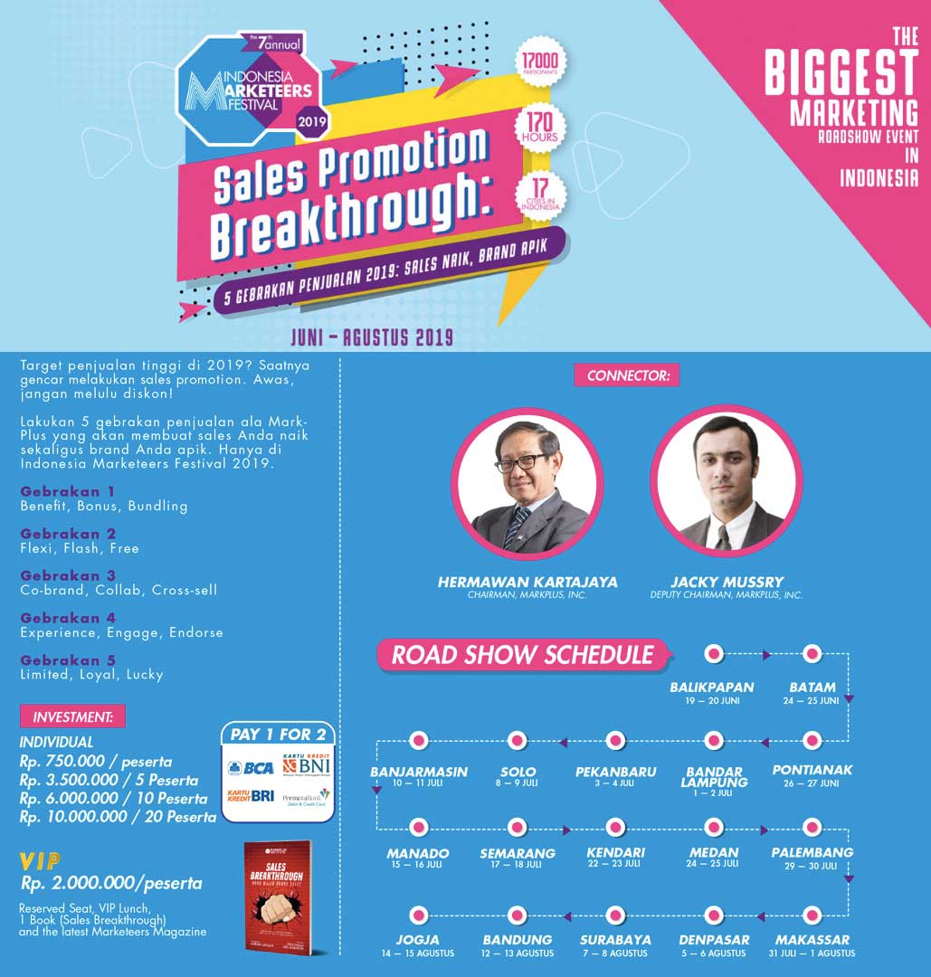 Selama 2 hari, acara festival kali ini mengambil tema “Sales Promotion Breakthrough: 5 Gebrakan Penjualan 2019, Sales Naik Brand Apik” Beragam pembicara dihadirkan Markplus untuk presentasi yang berkaitan dengan dunia marketing.