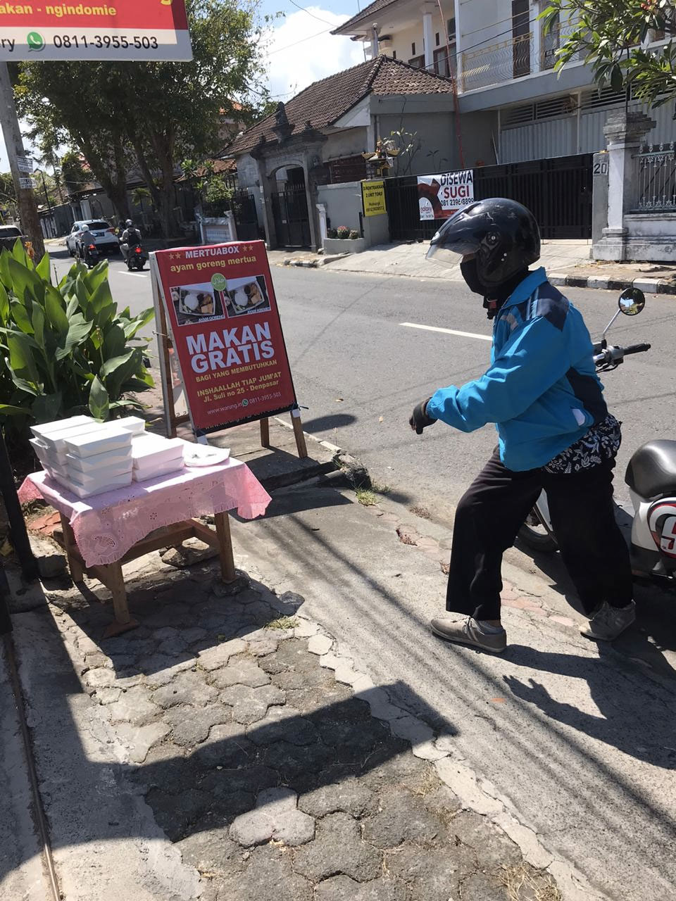 Makan Gratis kami mulai 24 Juli 2020. Alhamdulillah kemudian sesi ke 2 berlangsung 31 Juli 2020. Berusaha konsisten tiap hari Jum’at pukul 12.00 WITA di Jl. Suli no. 25 Denpasar – Bali. Berikut dokumentasinya. Untuk selanjutnya, dokumentasi ada di Fanspage Ayam Goreng Mertua. Mau ikutan? Bisa kontak narahubung 0811-3955-503 (Mak Shin).
