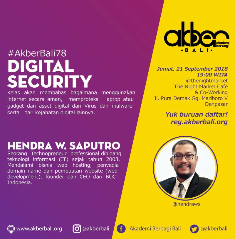 Ada beberapa relawan pengelola yang mempersiapkan kelas Akber Bali #78 akhirnya terjadi. Meski mulai nya malam, waktu itu pukul 19.00 WITA baru mulai. Dengan tema berat yaitu Digital Security.