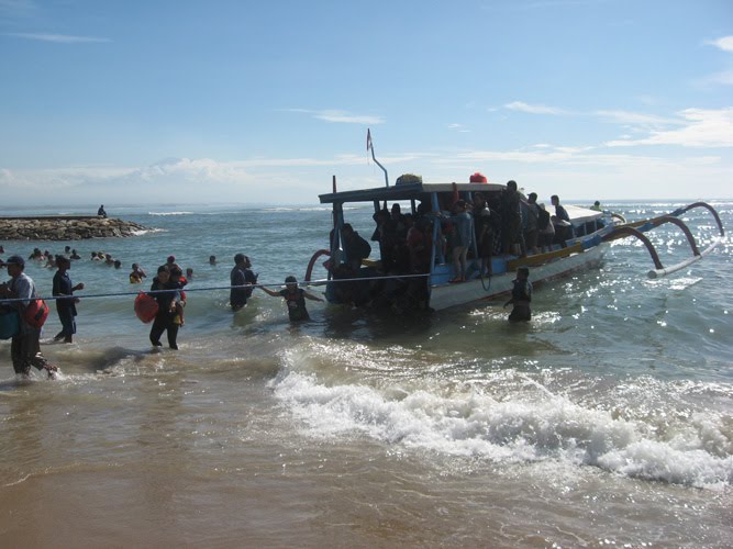 - Di pantai Sanur jangan membayangkan akan ada pelabuhan atau petunjuk naik turun penumpang. Aku pun kalau tidak diberi tahu tidak akan mengenali bahwa pantai ini selain pantai wisata juga digunakan sebagai pelabuhan. Berhubung jukung dan speed boat itu kecil, biasanya langsung bisa merapat ke bibir pantai. Jadi kalau baru pertama kali, sebaiknya perhatikan instruksi dari pengeras suara dari konter tiket untuk menandai jukung atau speed boat yang baru datang atau mau berangkat.